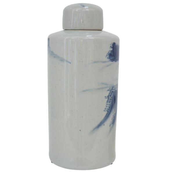 Elegant cylinder lidded Jar in a popular indigo palette featuring a contemporary hand painted cloud pattern.Measurements are 18x18x46cmh Made of 100% Ceramic