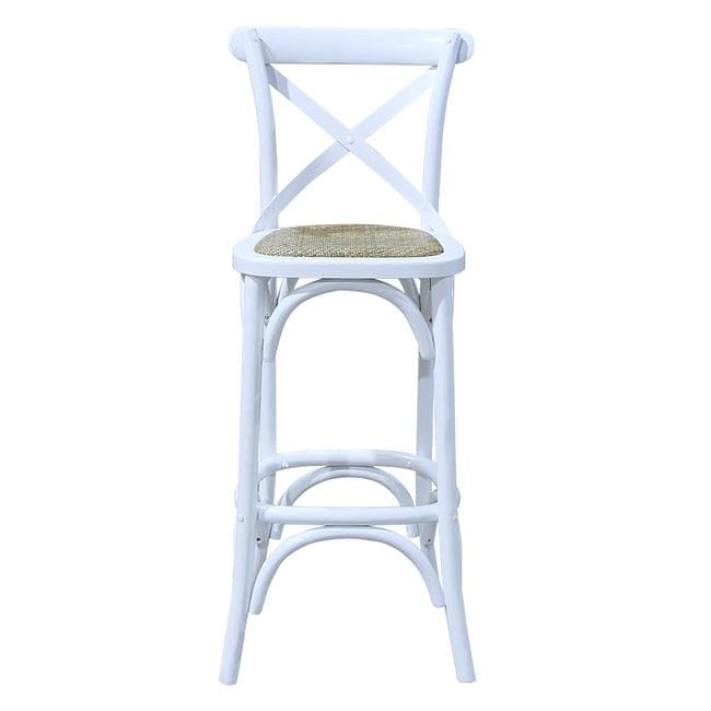 This casual living style cross back Bar stool is a timeless and versatile piece. These crossback bar stools have a curved back support and hand woven rattan seating offering long sitting comfort. With rustic features as well as exposed cast iron rivets,