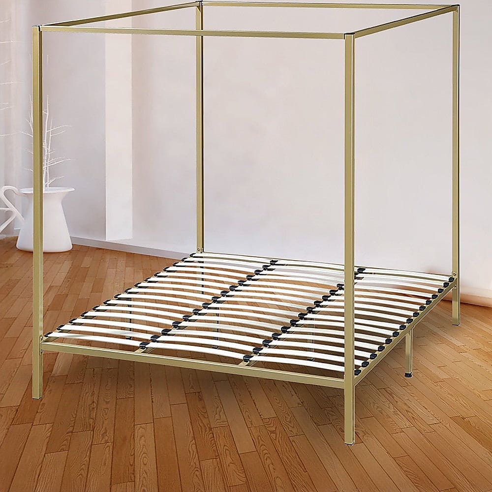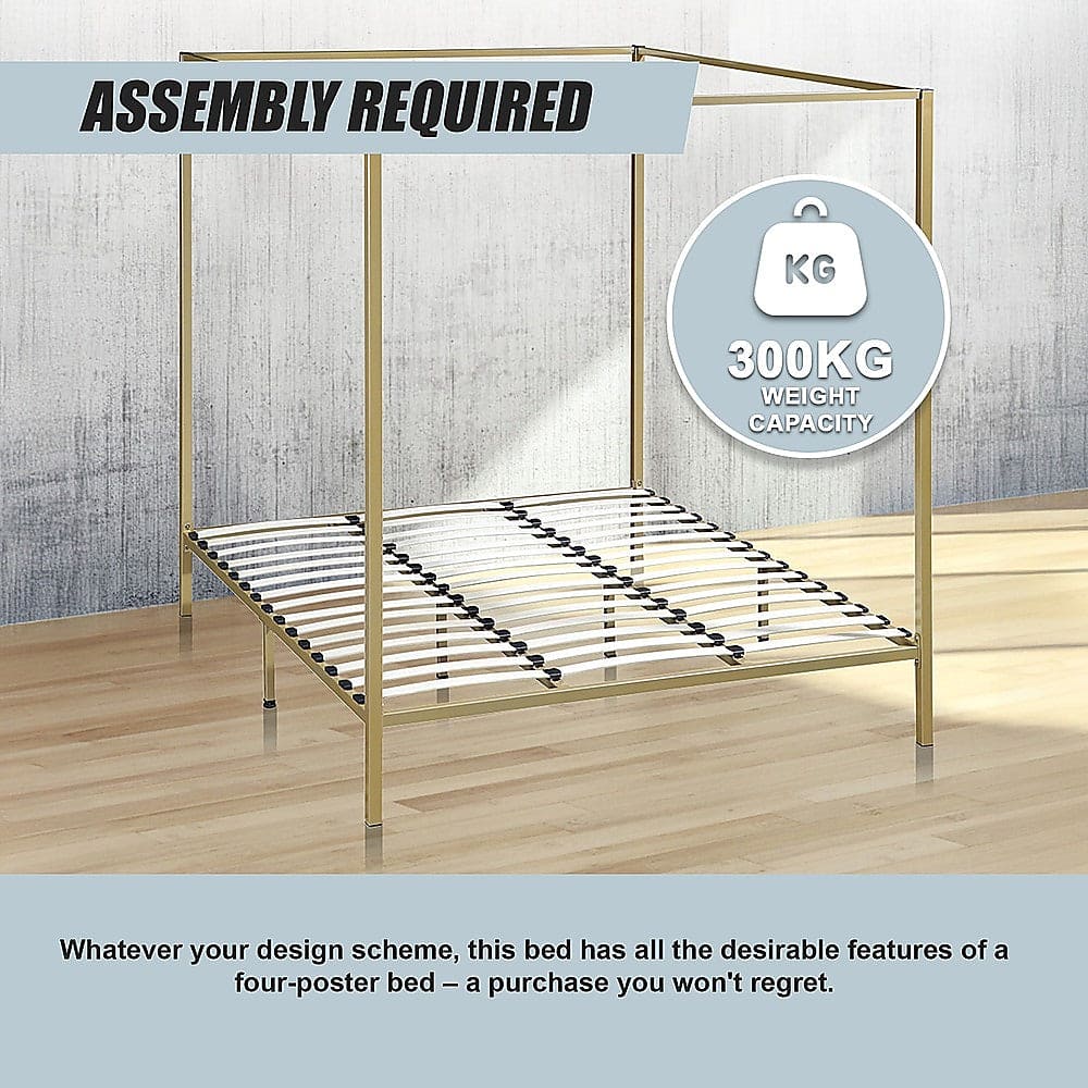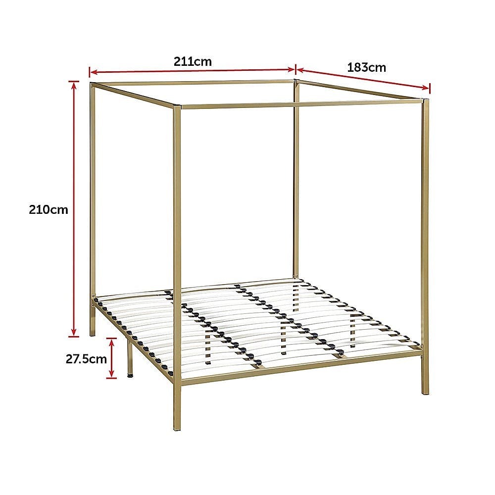 The bed's sleek gold frame is trendy and modern, making it a perfect choice for the 21st Century home. But if you prefer a more old-style', romantic look, its modest design means that it is easily dressed with drapes in order to achieve the style you want. What's more, the frame's neutral gold allows it to fit in with any colour scheme - Versatility at its best.