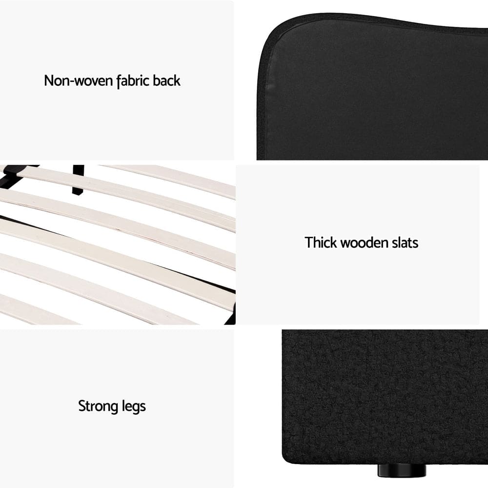 Introducing our elegant Artiss bed frame: upholstered in boucle fabric, featuring wooden frame with slat support, padded headboard, smooth edge finish, and sturdy metal connectors for a blend of style and functionality in your bedroom.