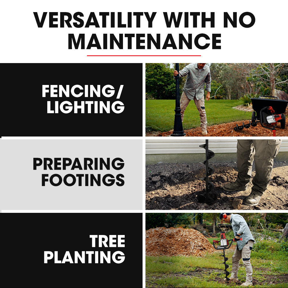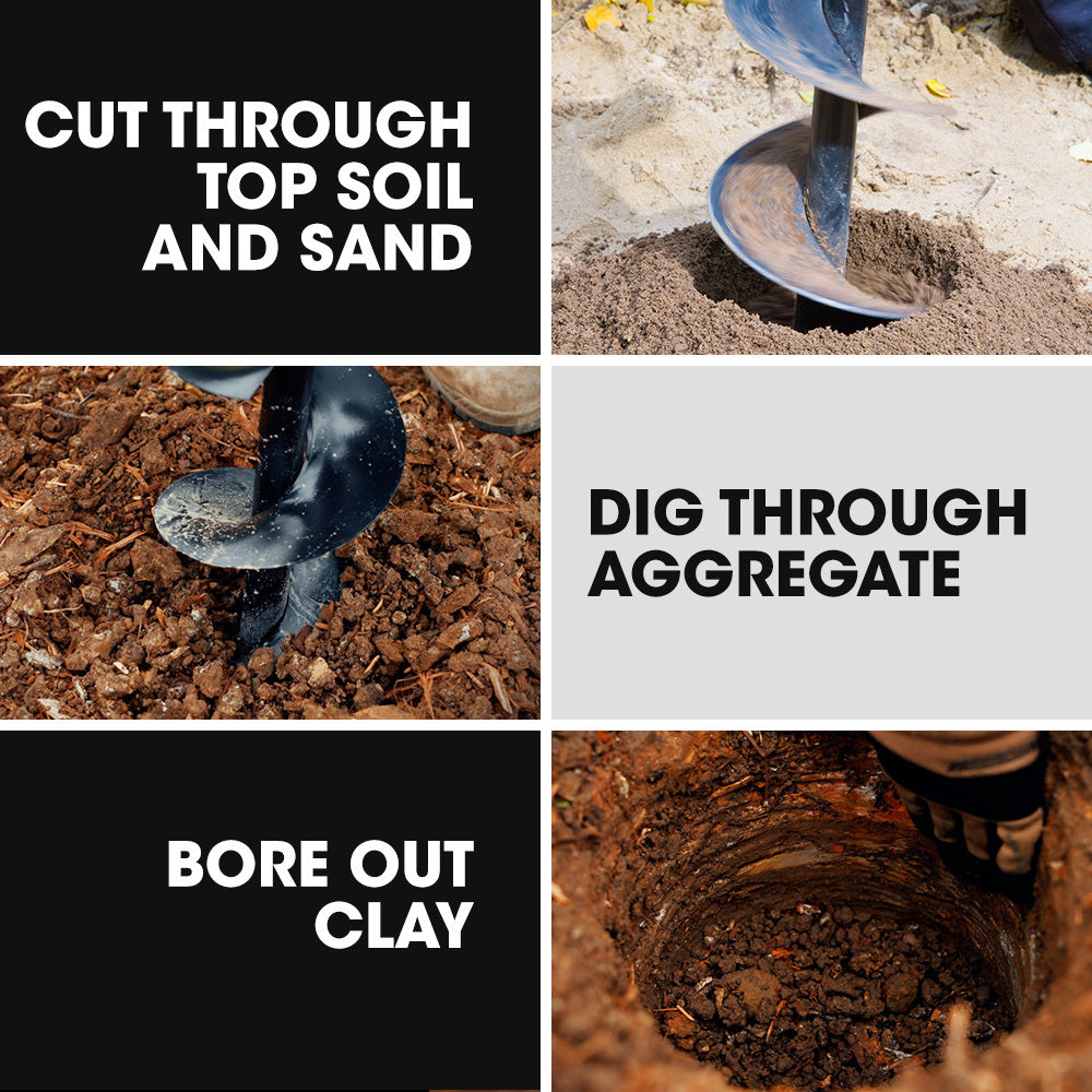 The BPX-500E Earth Auger comes with a Spirac tipped 15cm auger blade that quickly and efficiently digs what you need dug. You will dig holes for home improvements projects, lighting posts; decks shed; porches or garden improvements, greenhouses; flowers; seed or a whole tree.