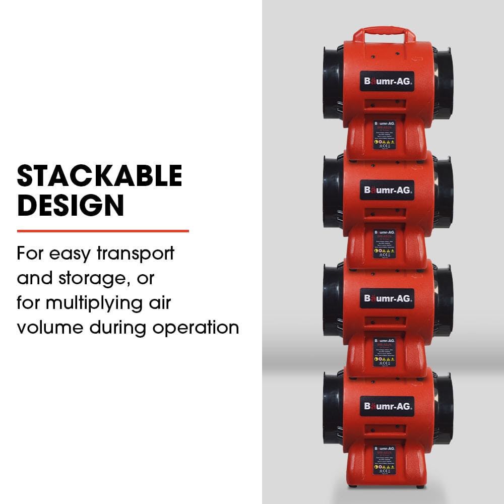 Designed with portability in mind, the compact Baumr-AG Air Blower has a carry handle and only weighs in at 7kg. It can conveniently be stacked up to 4 high for easy storage or transport, or to multiply air volume.