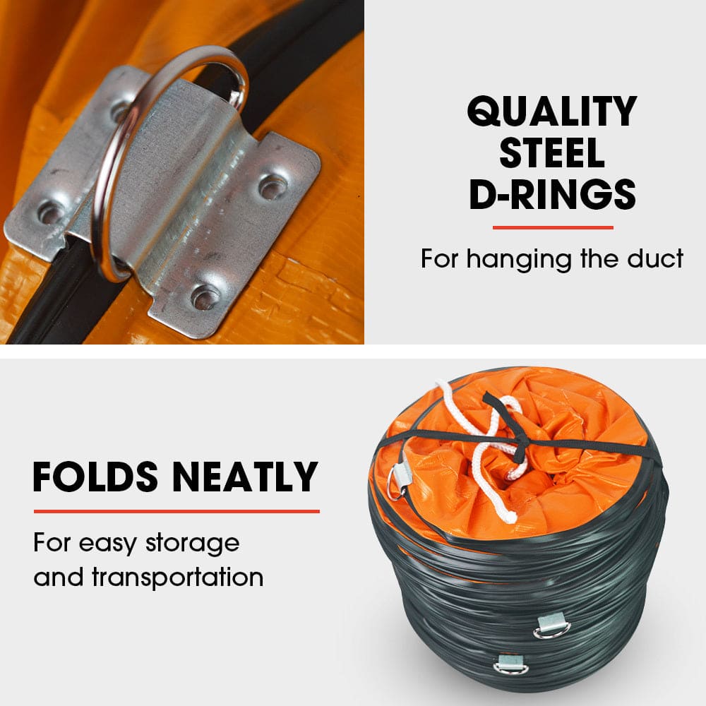 Quality steel D-rings are provided for hanging the duct, allowing it to be easily installed and removed as needed. The air duct can also be folded neatly for easy storage and transportation, making it convenient to take with you on the go.
