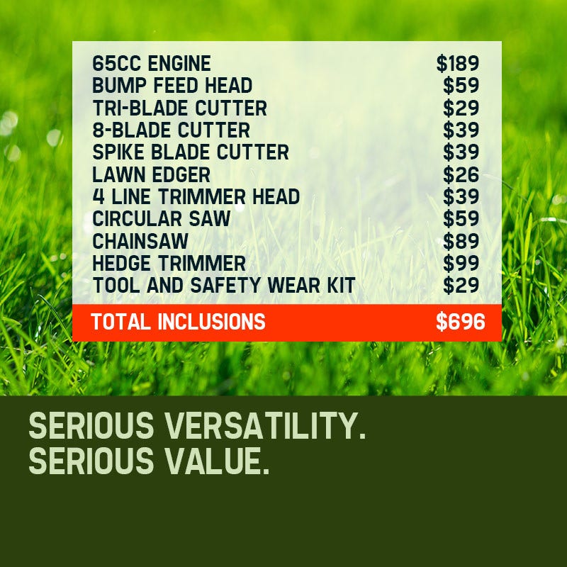 - BONUS ACCESSORY KIT (toolkit, gloves, goggles, ear muffs, shoulder strap, fuel mixer)