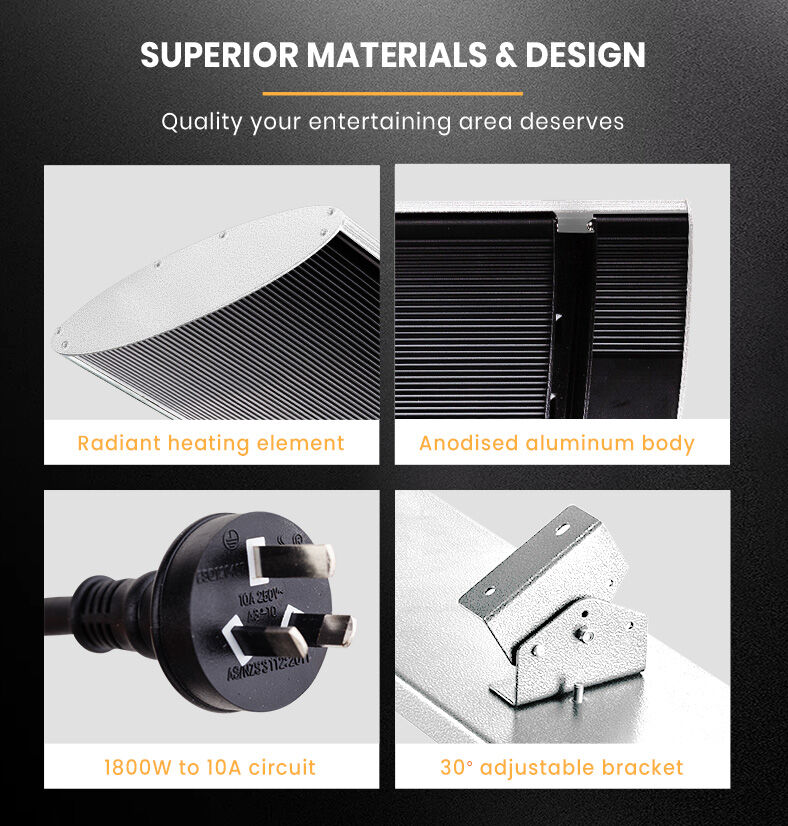 A 1800 watt electric element is embedded in the black anodised aluminium strip that rapidly produces even and gentle heat dispersion. Plus, unlike gas heaters there is no glow or glare, and no need to refuel - providing huge running costs savings.