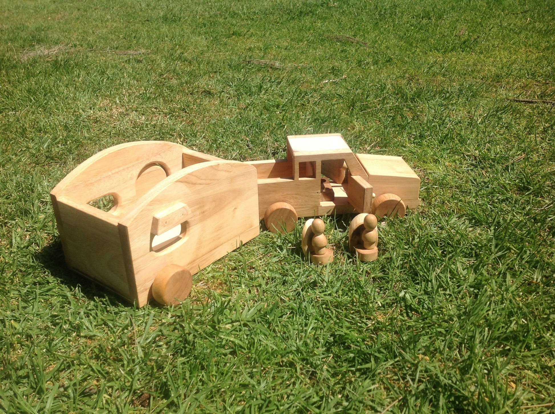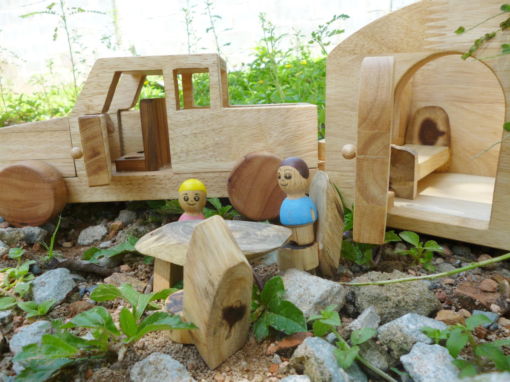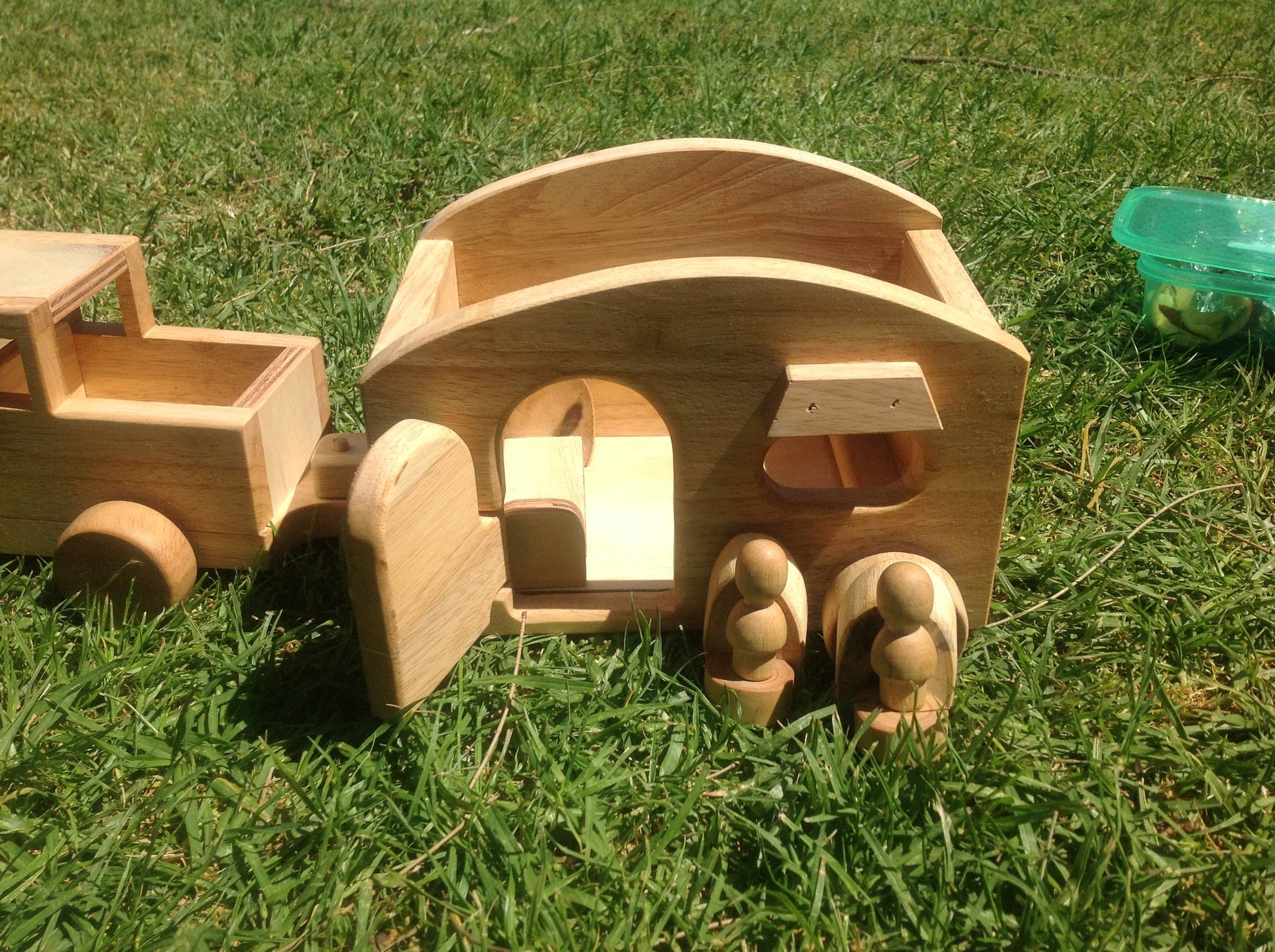Beautiful hand made caravan,with 2 wooden dolls and furniture ( bed and table and chairs) The set include a detachable mobile home with accessories and a car with 2 dirvers.. This is a quality toy that lasts! All toys are made of plantation timber, using non-toxic, child safe materials.