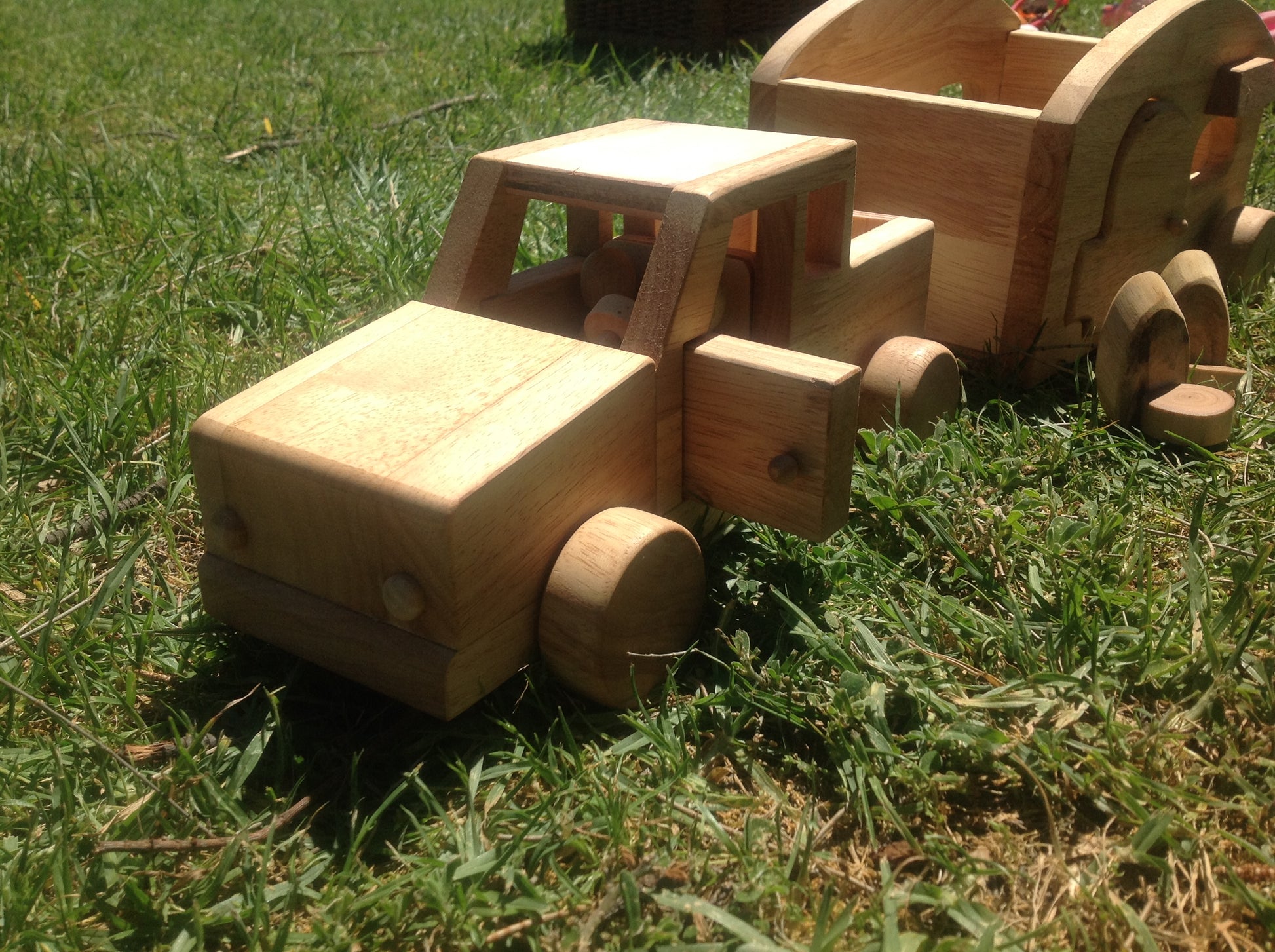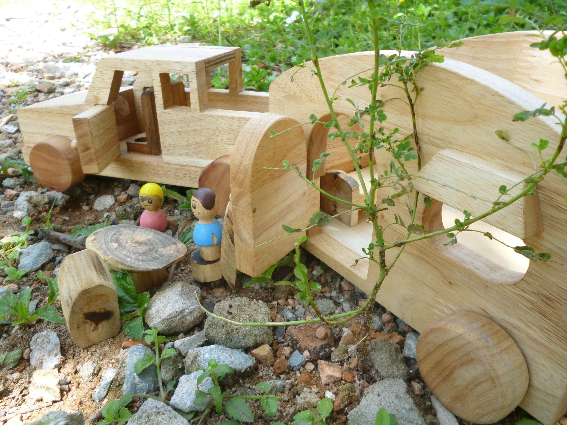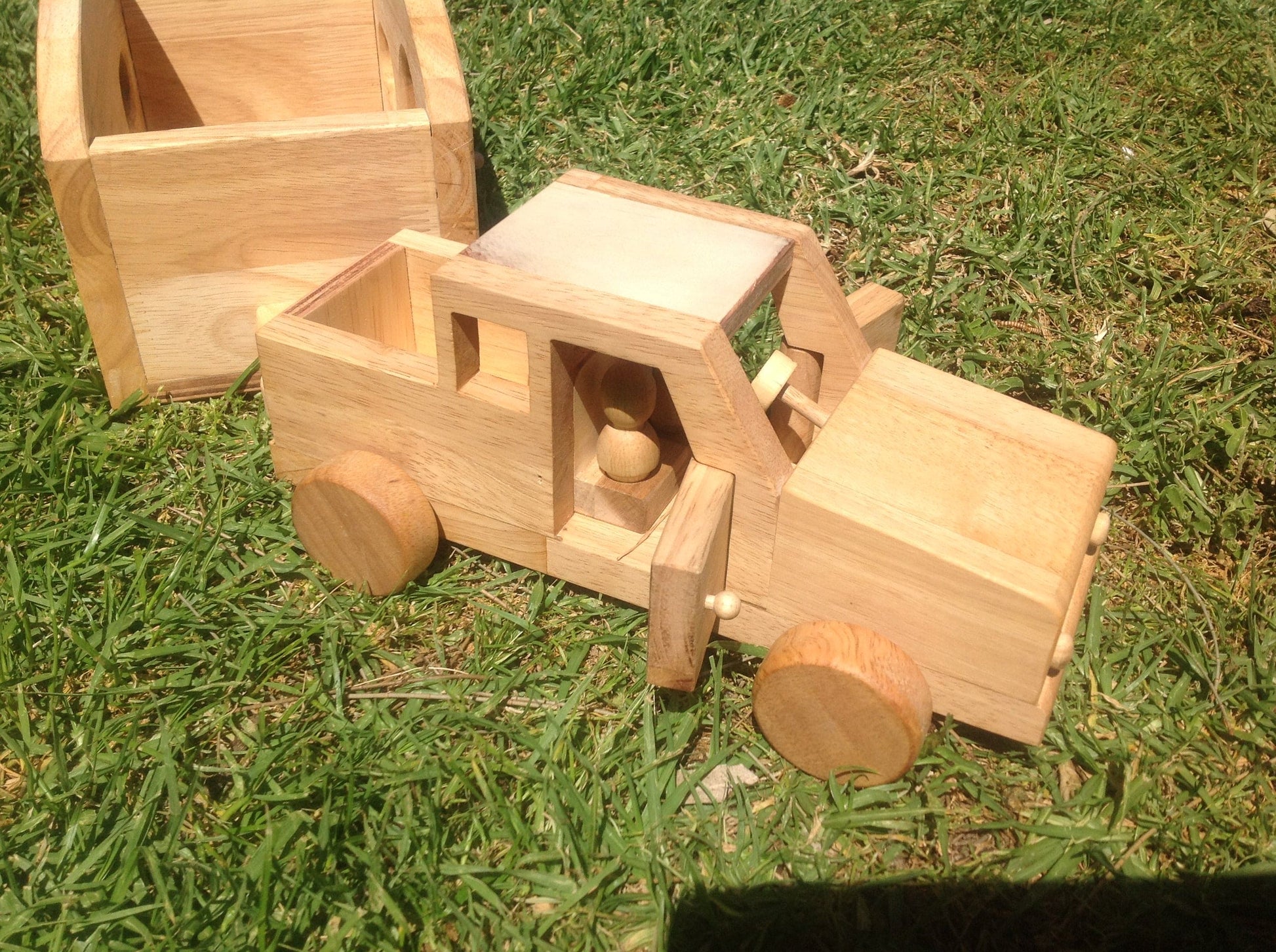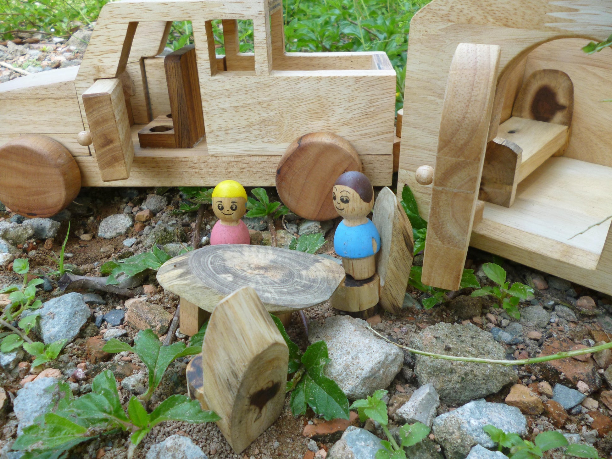 Beautiful hand made caravan,with 2 wooden dolls and furniture ( bed and table and chairs) The set include a detachable mobile home with accessories and a car with 2 dirvers.. This is a quality toy that lasts! All toys are made of plantation timber, using non-toxic, child safe materials.