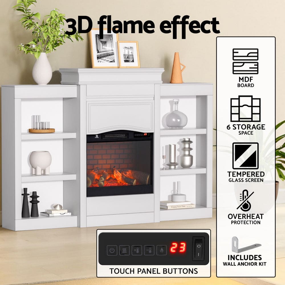 Enhance your living space with the Devanti Electric Fireplace, a perfect combination of style and functionality. Made from solid MDF with a sleek black tempered glass casing, this fireplace includes six storage spaces, featuring two three-shelf bookcases ideal for your d��cor or essentials. Enjoy the realistic 3D flame effect and rapid heat-up in just 30 seconds, with high and low heat settings and an adjustable thermostat to easily tailor the temperature to your needs.
