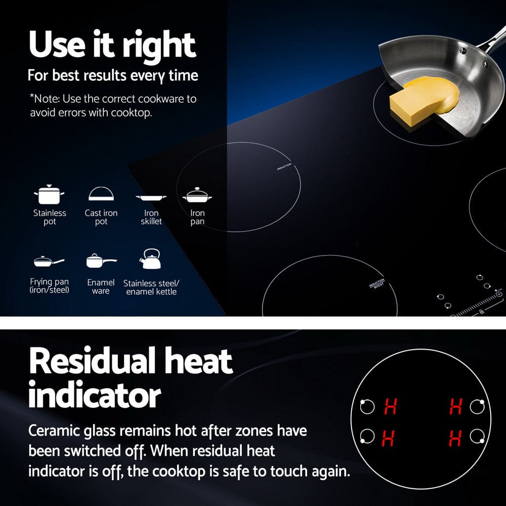 Whether it is for your existing or new home, the Devanti 70cm Induction Cooktop is just the thing you need for easy, no-fuss cooking. Loaded with an extensive list of chef-friendly features such as four high-wattage cooking zones, touch control and LED display panel, independent 99-min timers, overheat protection and efficient heat dissipation, this cooktop is also incredibly sleek with its high-grade black ceramic glass plate. It features nine power levels to choose from to prepare that perfect dish. Plus, the residual heat indicator also helps to tell when it is safe to touch the cooktop after turning the hot plates off, and a child safety lock prevents accidental usage. Better still, the cooktop will turn itself off when temperatures get excessively high, or you simply forget to turn it off after your cooking. Powerful and yet integrally safe, the cooktop promises many moments of hassle-free delicious cooking with the right blend of sophistication and class for your kitchen.