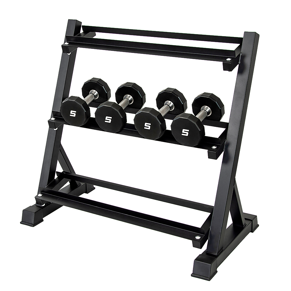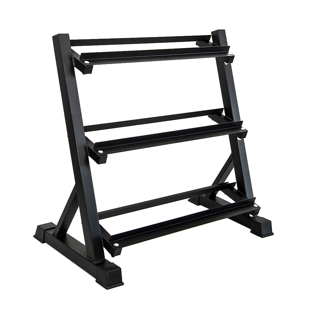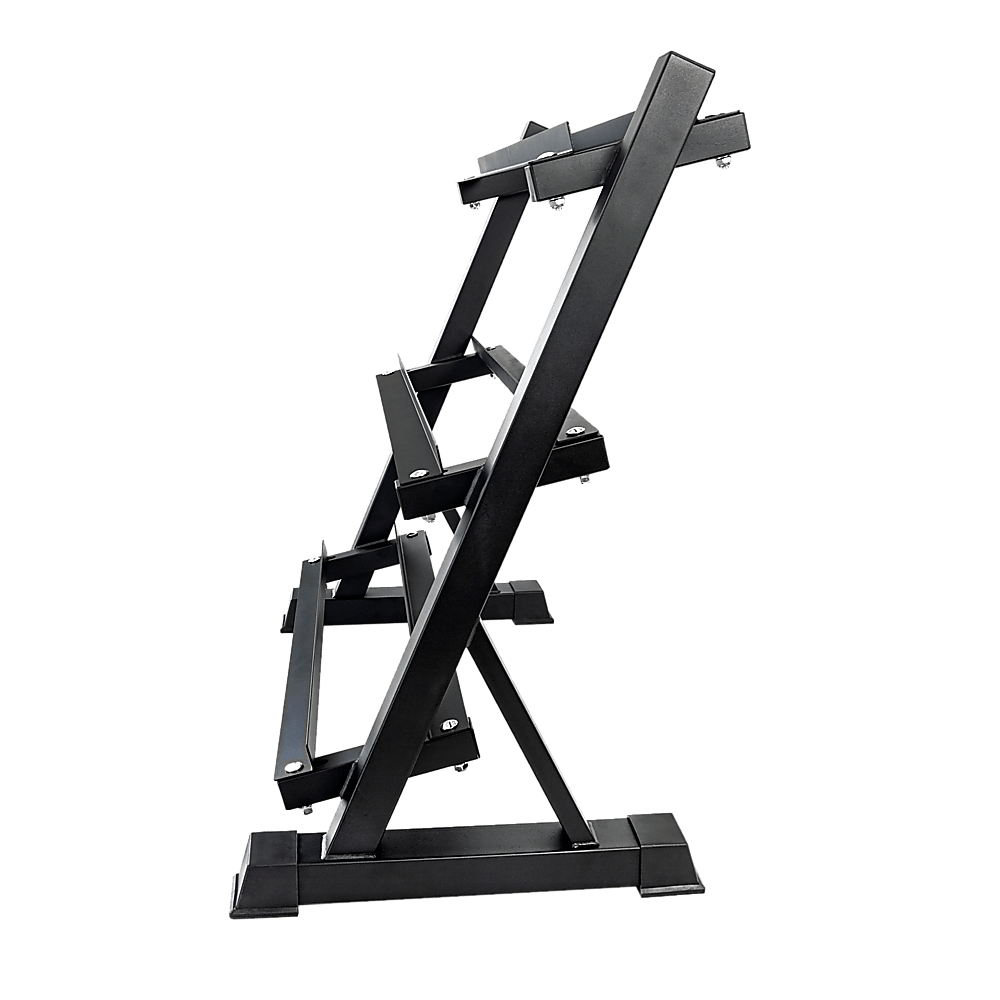 The rack is built to handle up to 300kg and has angled shelves for easy loading of the weights and seamless de-racking. It comes with three tiers so you have enough storage and not have your dumbbelss left lying around.