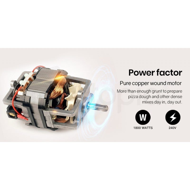 Construction of this 30L model is heavy-duty throughout, as attested to by the mixers substantial 97kg weight. Unlike inferior models that employ a noisy chain drive system the Eurochef Commercial range features a high torque dual-belt drive system. A timer allows you to program and set appropriate mixing times for various products. Built-in safety features include emergency stop and bowl guard switch.