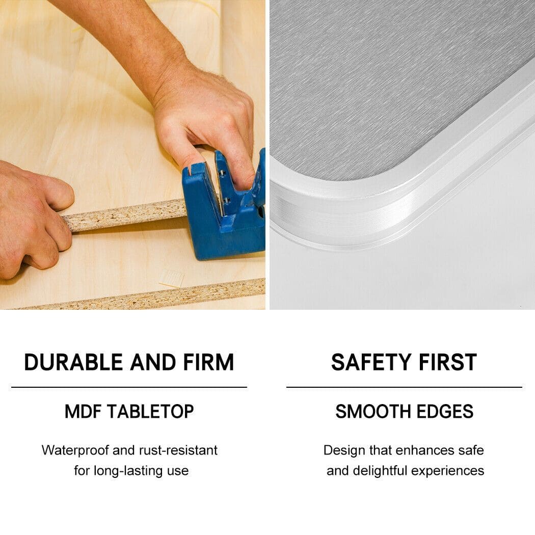 Made of strong aluminium throughout, the Camping Table can handle up to 40kg in weight with its rust-resistant MDF table top. The four integrated seats have a weight capacity of 100kg per seat, which makes the seats suitable for anyone to use. Not least, the rounded corners ensure the Camping Table is safe to use around kids and adults at all times.
