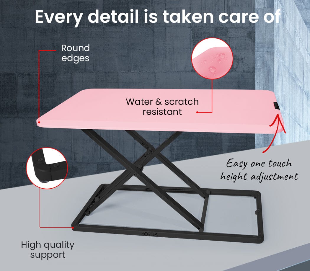 The FORTIA Pink Sit Stand Laptop Desk Riser is an ergonomically designed height adjustable workstation which allows you to find a healthy balance between standing and sitting. Perfect for use in your home office or in the workplace, you can instantly and easily alter your position to sit or stand, maximising your comfort and attention levels during work or study time.