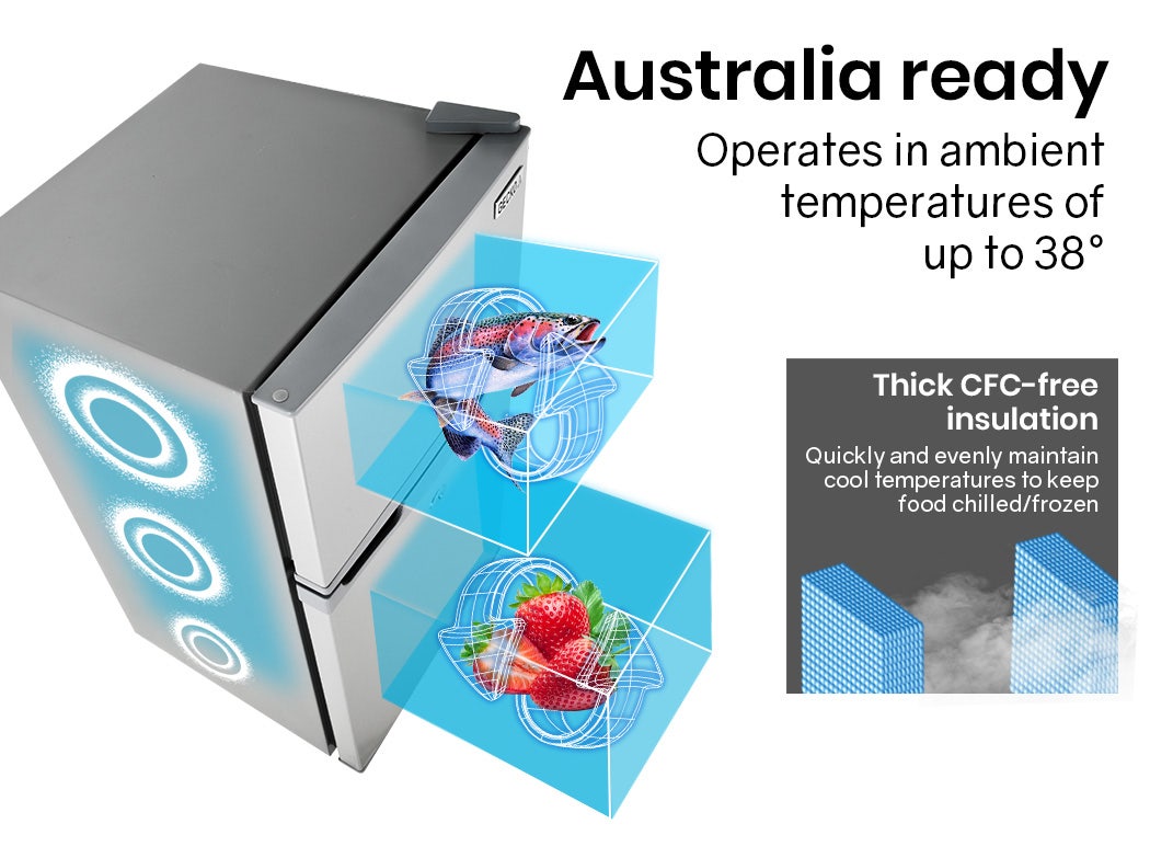 It boasts a generous capacity. Comfortably cater for long road trips in your motorhome or caravan. It has a 27L freezer compartment, and 68L refrigerator section with crisper, adjustable shelves and convenient egg tray. The rugged hinges, locking doors, adjustable feet and the ability to operate at up to a 30-degree incline make it ready for camping off the beaten path, or use on a yacht.