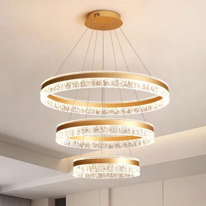 Enhance your living space with our Modern Luxury Ring Pendant Light. This stylish and elegant chandelier features a water ripple design, offering a sophisticated touch to your living room, dining room, or bar area. The light provides flicker-free, fine, and natural illumination, with three adjustable color temperatures: cool white, warm white, and warm yellow, to suit any ambiance. The adjustable suspension wire fits different ceiling heights, making it adaptable for various floor levels. The acrylic light diffuser, precision laser-cut lampshade, and energy-saving LED light source ensure high brightness, true color rendering, and eye protection. Built with durable materials including acrylic, aluminum, and iron, and finished with a high-temperature baking paint process, this chandelier is both beautiful and long-lasting. Available in a luxurious gold color with three rings of sizes 40cm, 60cm, and 80cm.