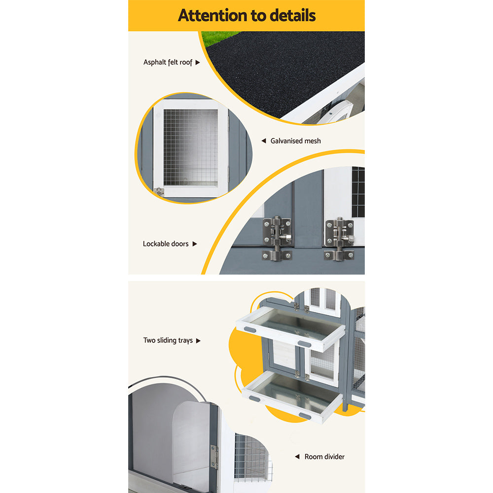 Rabbits love to hop, hide, stretch, leap, do a flop or binky, and race around. These behaviours are essential to making sure they are normal. So why not give them the home they deserve? The i.Pet's rabbit hutch, specially designed for cute bunnies, is good stuff your rabbits need to act like rabbits. Your bunnies will love it so much that they will rub their chins all over this rabbit hutch to mark their territory and do a happy dance. Not just rabbits, it makes a comfortable home to guinea pigs, hamsters, chinchillas, and ferrets too. Built from solid fir wood with galvanised mesh, our rabbit hutch is sturdy and durable. It has a firm base that ensures stability and prevents tilting even with your bunnies hopping and spinning to a great extent. The asphalt felt roof offers good protection from sun and rain, keeping your pet cat cool in summer and warm in winter. Rain or shine, this rabbit hutch will provide unlimited hours of entertainment and fun to your beloved bunnies. Our rabbit hutch has built-in ramps that connect different floors, room dividers, entrance doors with locks for convenient entry and exit, and two sliding trays to collect droppings and easy cleaning. Nice and roomy, the rabbit hutch boasts a mesh design that allows proper airflow and keeps your pets well-ventilated. Gift our i.Pet's rabbit hutch to your bunnies today, and be sure to get much love in return. It's sure to give your beloved bunnies the utmost joy and pleasure.