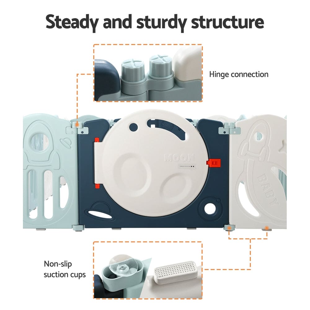 As a parent, sometimes you need a moment to catch your breath while keeping a watchful eye on the little ones. Keep your children safe and sound while you work with a Keezi Baby Playpen. The pen is made from quality HDPE material that is child-safe, non-toxic and easy to clean. It features a flexible 16-panel arrangement with no sharp edges and a safe 63cm height to prevent your child from crawling out. Each panel is connected to a hinge, and the main door panel has a safety lock to prevent a cheeky escape. Anti-slip suction cups keep the playpen firmly in one place. Easily assemble, fold and unfold the playpen for portability and simple storage(The door needs to be removed to fully fold). When you need a safe space for your child, Keezi has you covered with the Keezi Baby Playpen.
