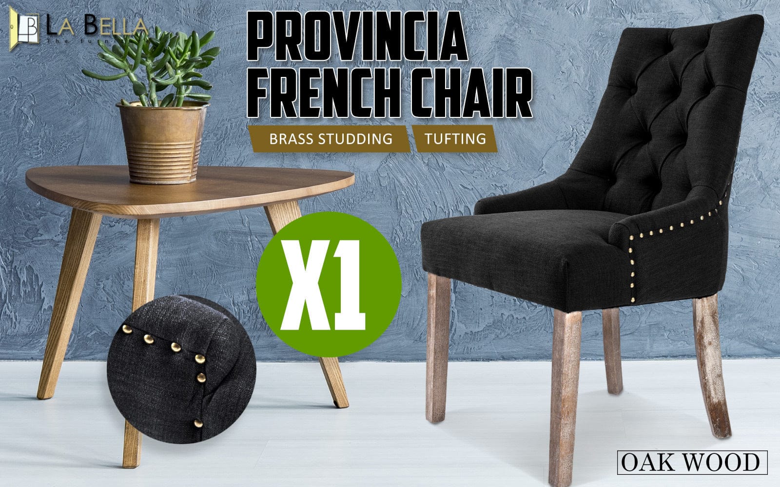 La Bella French Provincial Dining Chair Amour Oak Fabric Studs Retro - Dark Black