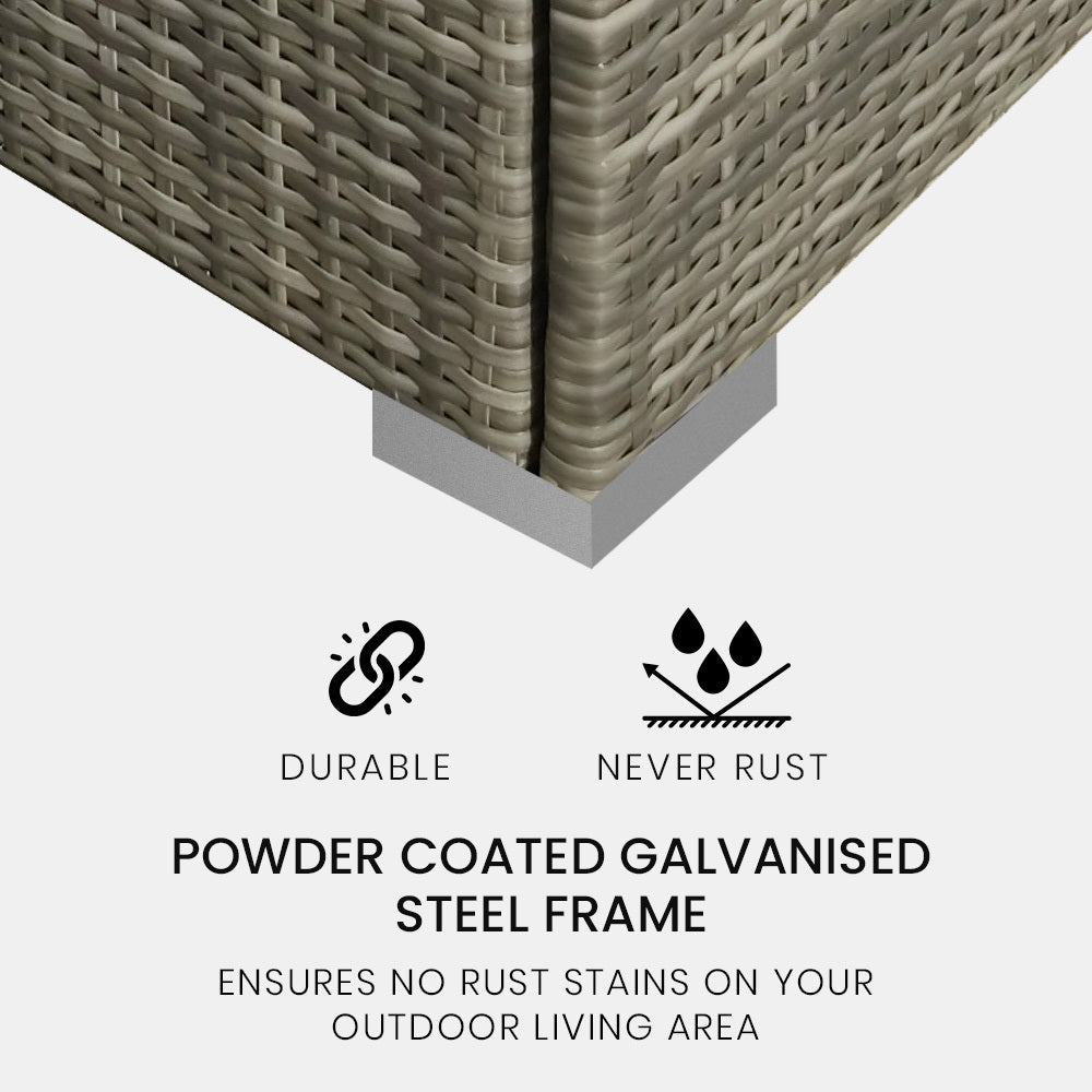 The London Rattan 3 Seater Outdoor Lounge Set is a stylish yet affordable setting designed to provide utmost comfort. The London Rattan outdoor furniture setting has a durable galvanised steel frame with additional powder coating, ensuring no rust staining of your outdoor living area.