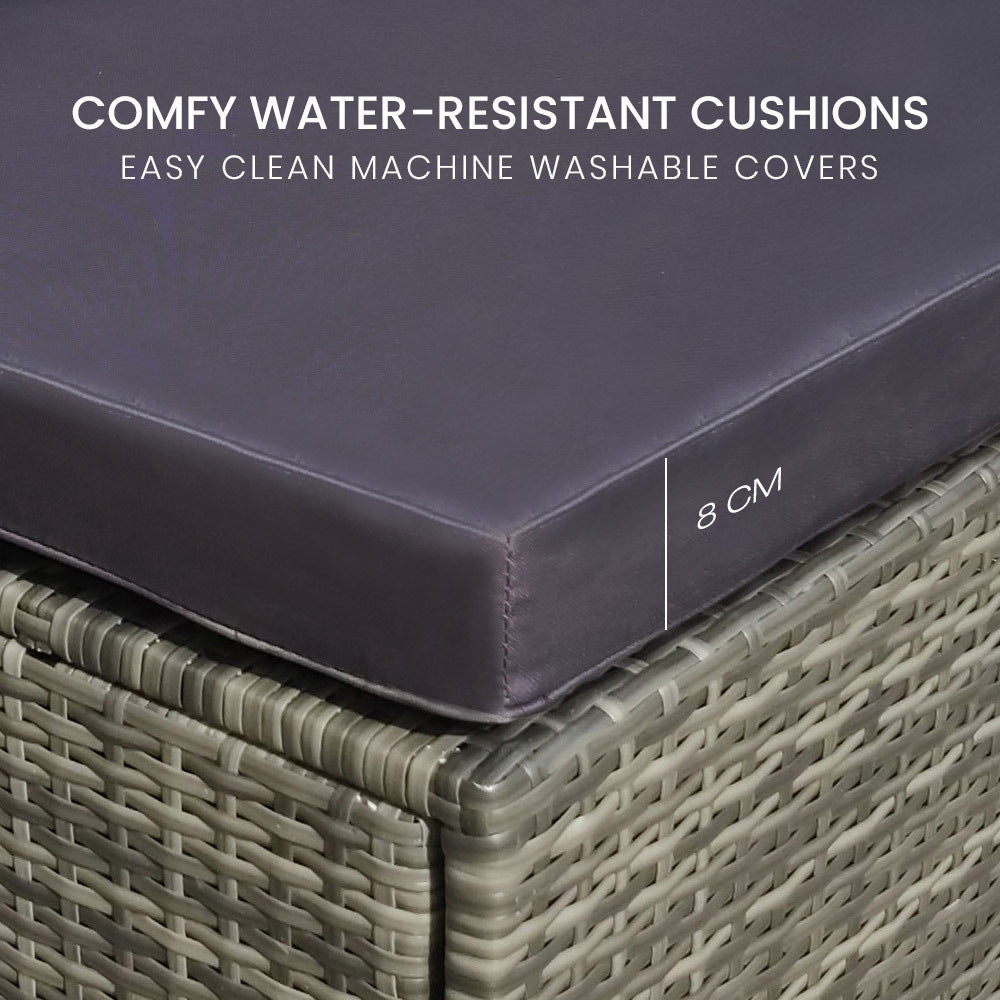 The set includes ultra-comfy 8cm thick water-resistant seat cushions, generous backrest cushioning and 2 premium throw cushions. The high-quality UV-resistant handwoven Suntech wicker in Marl Grey weave has a premium natural textured look. This is a modular design comprising three sofas, two corner sofas, plus a coffee table with tempered glass table top. You can set it up in whatever configuration works best for you, making this London Rattan outdoor lounge setting a great addition to any outdoor space.