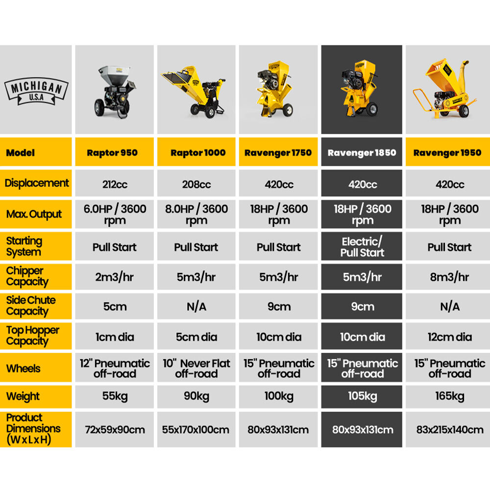 MICHIGAN 18HP 420cc Petrol Commercial Wood Chipper, Electric Key Start, Tree Mulcher - Ravenger 1850