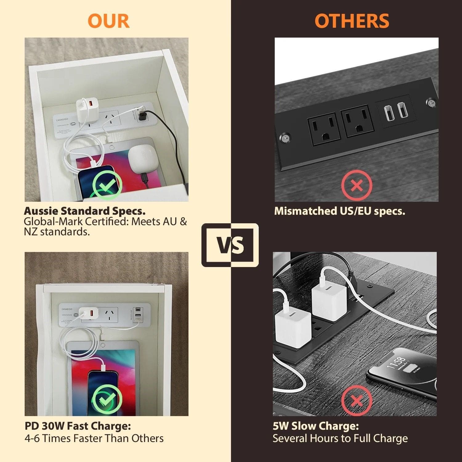 - This unique white side table is the perfect addition to any home or office. It is certified for electrical safety with Australian Global-Mark certification, and features PD30W fast charging and USB Type-C, as well as lightning and surge protection for safe power use.