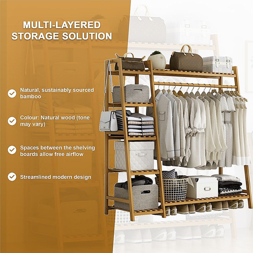 Create a fresh, natural look in your bedroom, entryway, or walk-in wardrobe with this eco-friendly bamboo clothing rack by Randy & Travis Machinery. With five tiers of storage, hooks, a hanging rod, and seven shelves, you'll have plenty of space to organise your entire clothing, accessories, and shoe collections. Crafted from solid natural bamboo, this clothing rack has an uncluttered, Nordic-inspired design that will accent your room's décor. Done in a neutral finish, it will blend in well with the colour scheme in nearly every home.