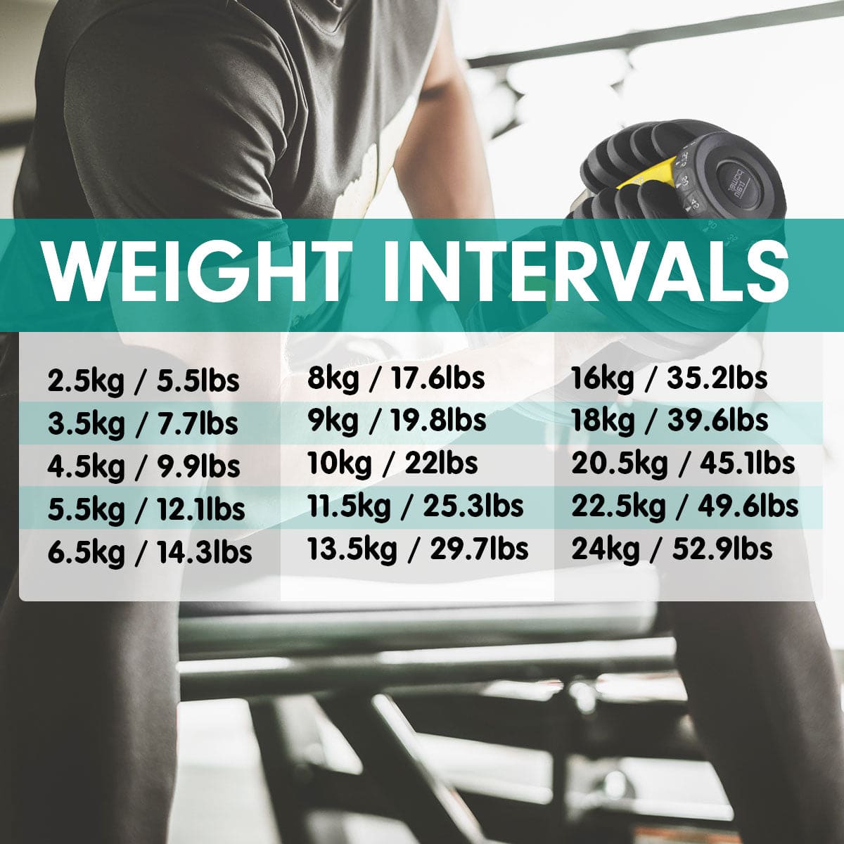It adjusts in 2.5-pound increments up to 25 pounds and then in 5 pound increments, enabling you to gradually increase your strength while training with the perfect weight to push your limits.
