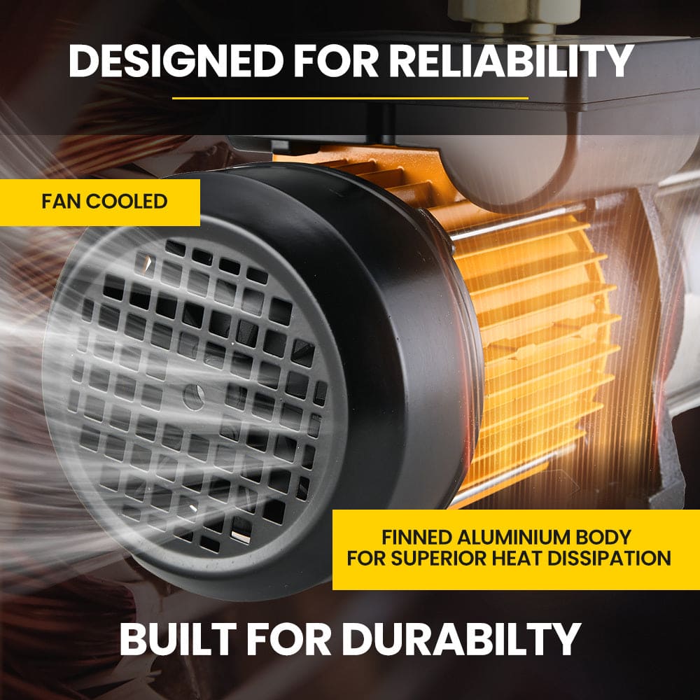 Protege pairs the pump with a pure copper wound 1100-watt (1.5 hp) motor with a surge maximum of 1320-watt (1.8 hp). Giving this efficient motor reliability and longevity is its construction. With its copper wound rotor and heavy-duty stator, the motor is mounted in aluminium with a finned heat sink chassis that keeps it running cool.