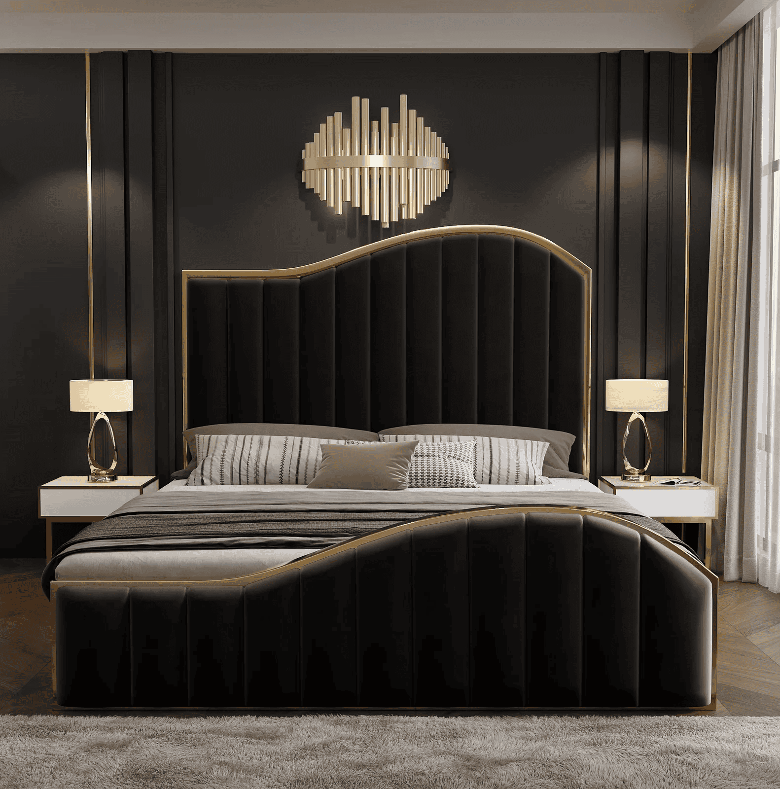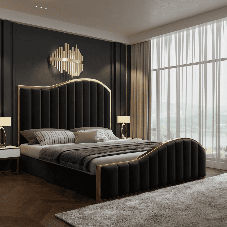 Our newly arrived Star shine bedframe has an Elegant look with its premium velvet fabric in black color. Its beautiful Headboard and Footboard come with a golden metal trim making the bed a perfect fit for a sophisticated bedroom.