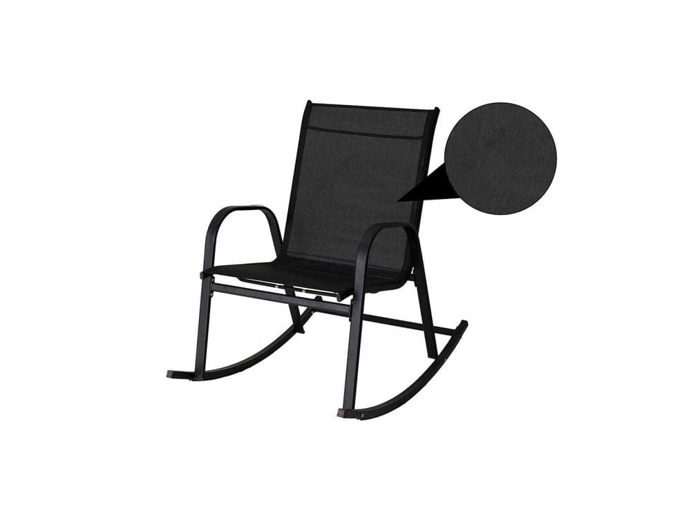 Bring contemporary style and classic functionality to your outdoor living spaces with outdoor rocking chair. This decorative and comfortable patio rocking chair is sturdy and easy to maintain. The distinctive designs on the chair\'s arms and back give this rocker a traditional look. The textilene fabric mesh seat and back of this rocker boast a long-wearing black finish. This rocking chair also features an extra-wide seat, which holds one person weighing up to 150kgs. Lying on no pressure, enjoy a peaceful day in your backyard with this rocking chair.