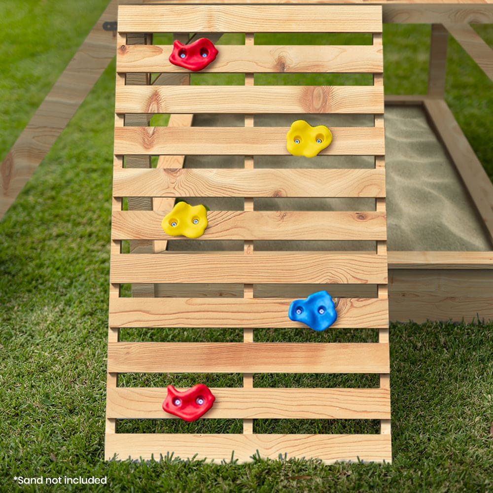 Packed with awesome features, it comes complete with a number of unique features for maximum fun. Not only is there a wavy style slide, but there is also a climbing panel with colourful rock climbing holds and an interactive noughts and crosses game! Plus, the elevated design also provides space for a sandpit underneath.