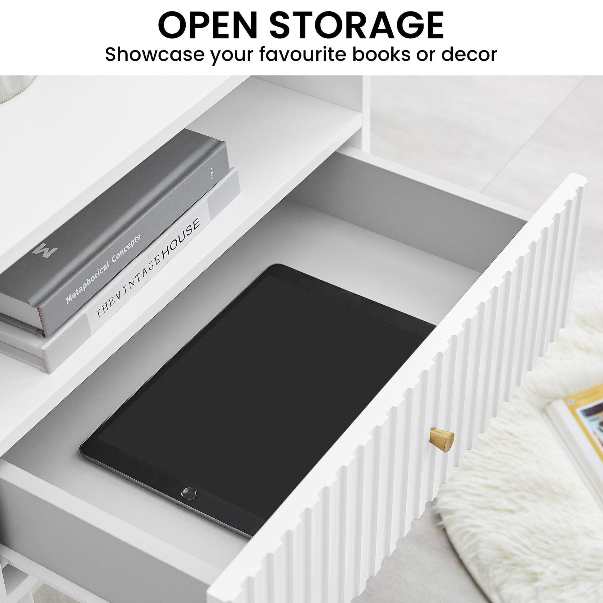 Add a touch of modern luxury to your space. The Cecil Side Table is a testament to chic contemporary design. The slender fluted design brings out sophistication, while the open storage provides a stylish platform for showcasing your favourite decor. Keep clutter at bay with the discreet drawer, ideal for stashing essentials. The metal legs ensure stability while giving this piece a modern flair.