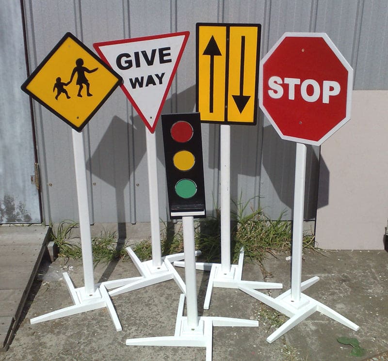 This set of Traffic signs offers a fabulous complement with bike rides. This set of 5 road safety signs will assist children becoming road safety aware. This set also great for Role play, which helps children to develop language and communication skills. It develops and promotes creativity and imagination. This resource also promotes social interactions, teaches daily routines ans skills. The set includes 5 signs basic signs: STOP, GIVE WAY, 2 WAYS, CHILDREN CROSSING and a traffic light that can change lights.Some basic assembly of the road signs is required. All signs are made of solid plantation timber and child safe materials.