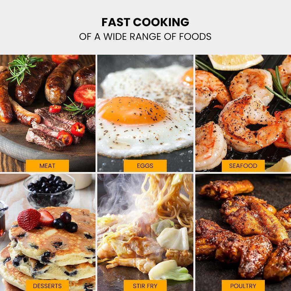 The Thermomate Commercial-grade Electric Griddle is the perfect countertop cooking solution for busy food vendors. A comprehensive heat element is powered by 4.4kW of heating power via the convenience of two 10A plugs, so you can use it anywhere. With dual zone temperature control from 50 to 300C, it offers the versatility to cook everything from steak to stir-frys to pancakes.