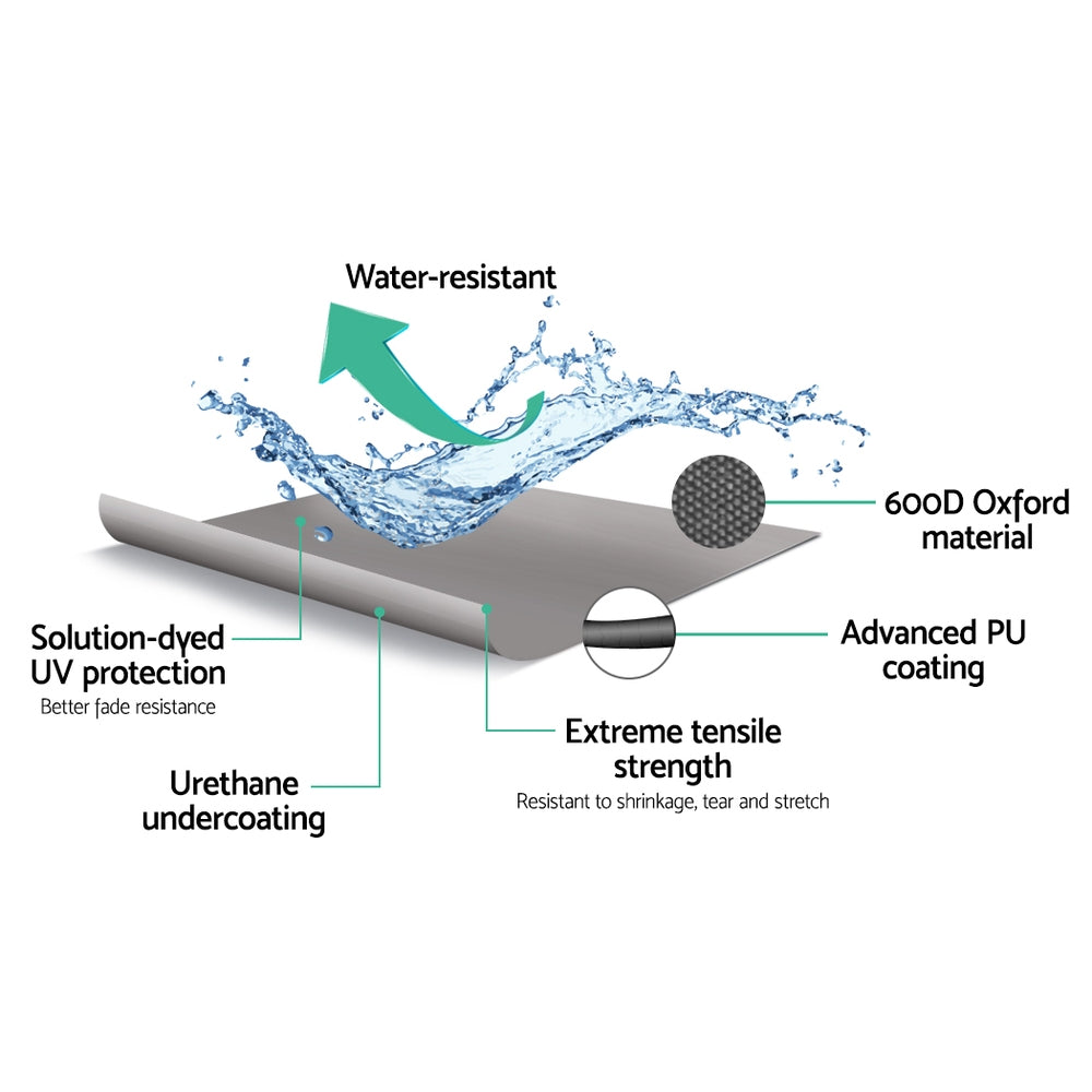 The Cover is made of 600D polyester with PU coating for effective UV and mildew resistance. It also features elastic hems for easy fitting and double-stitched seams for added strength.