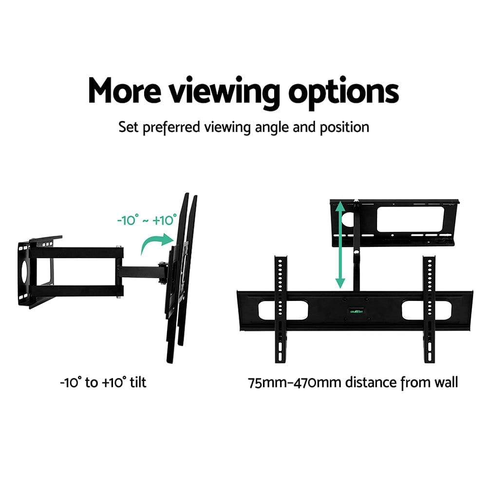 With universal compatibility with most major TV brands, our Artiss TV Wall Mount is designed to add a seamless touch to your entertainment set-up. Crafted in solid black powder-coated iron, the TV wall mount features a 1.5mm thick frame that can handle a maximum weight of up to 50kg and has flexible mounting with various VESA measurements to firmly affix any TV screen from 32" to 70". Better still, the mount allows for tilt and swivel so that you can adjust your TV to suit your most comfortable eye line for more enjoyable viewing. Plus, the three-arm design also enables the TV to be extended or retracted when required. Not least, a built-in safety bolt lock keeps the TV firm and steady at all times. Suitable for concrete or brick wall use, the Artiss TV Wall Mount is definitely the way to space-saving epic TV entertainment.