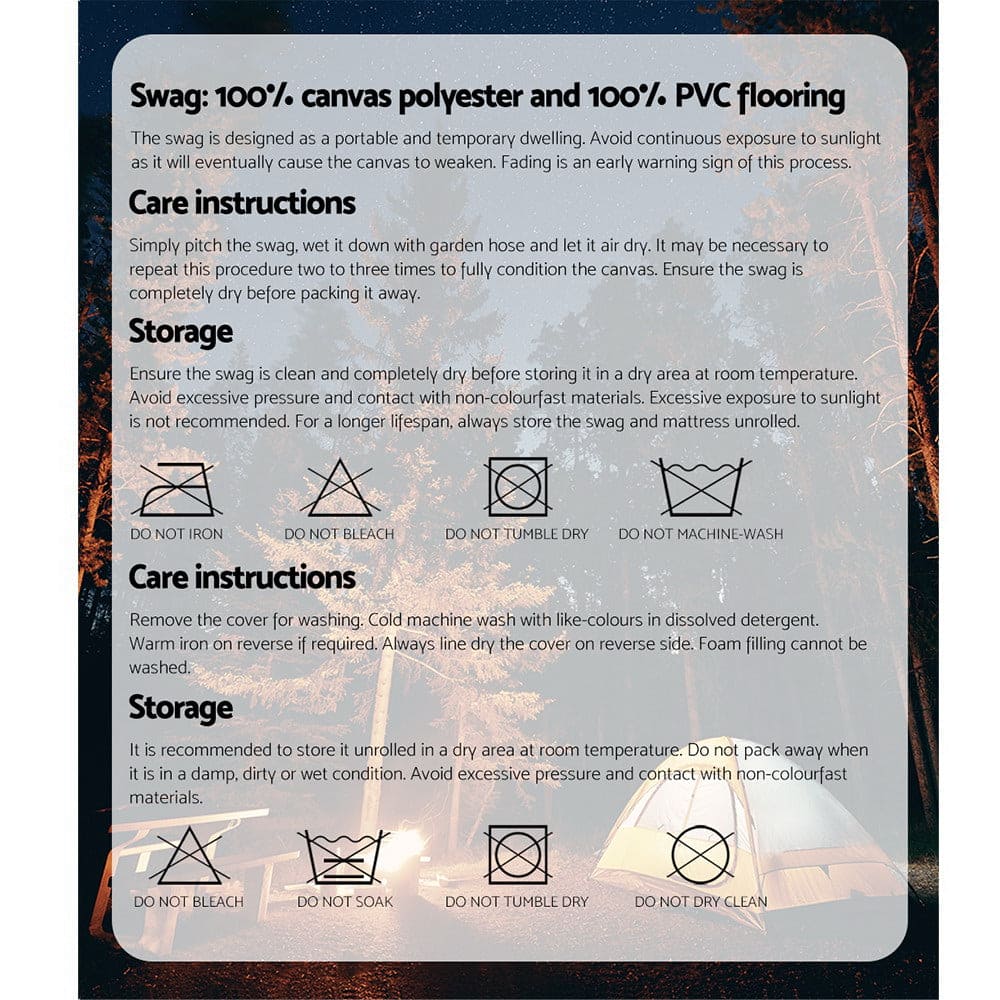 A 14oz 400gsm water-repellent Rip stop canvas cover, 500gsm PVC waterproof flooring and an extra 10cm high edge all round. Swag speak for the ultimate tear-resistant waterproofing. Fully enclosed for privacy with zipped openings for fresh air anytime. Mesh panels to keep insects out. Pre-curved Aluminium poles structure design support to hold up the entire set up.